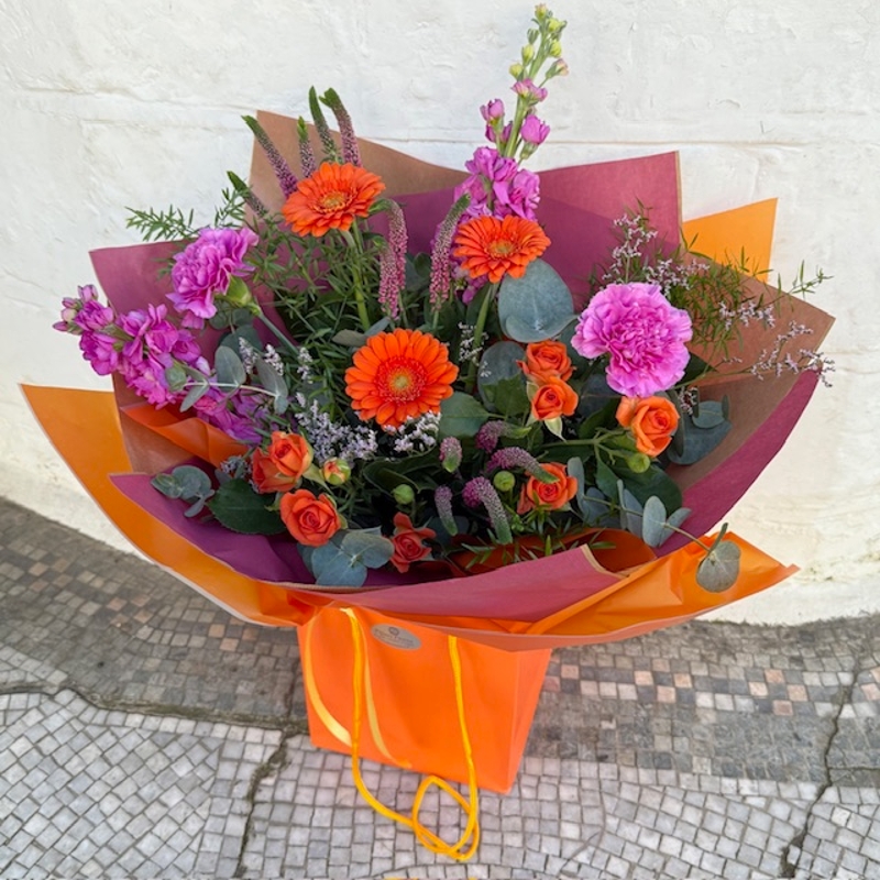Beautiful and bright, clashing pink and orange blooms, including germini.