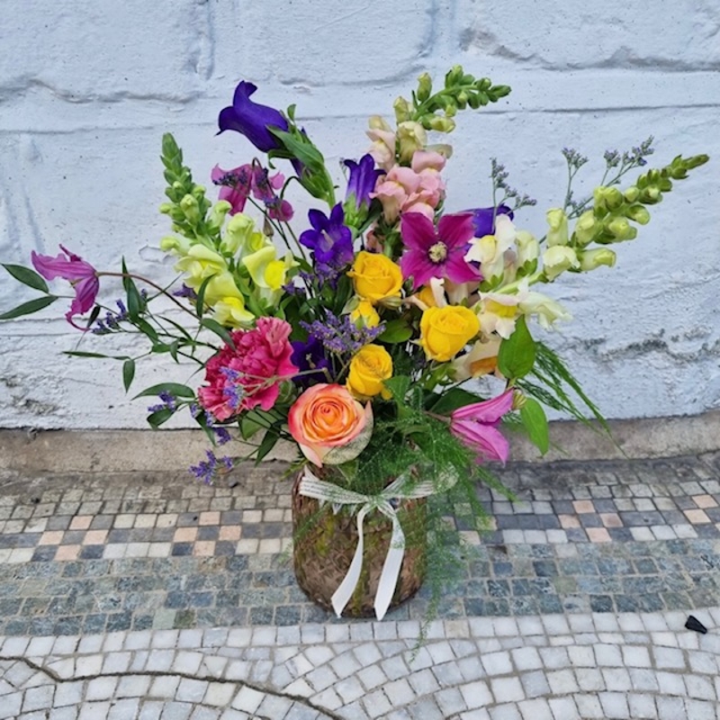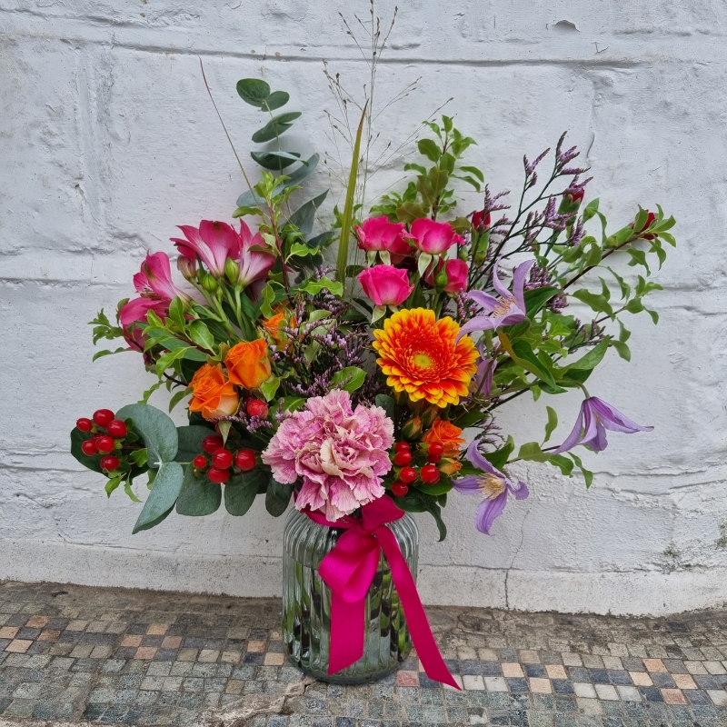 A ribbed glass vase of the brightest blooms to spread some cheer... no two creations the same!