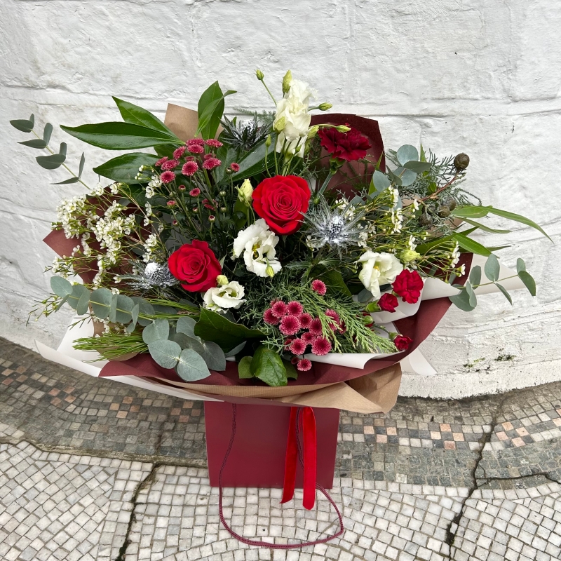 A truly festive hand tied including red roses, finished with a touch of snow and seasonal foliages.