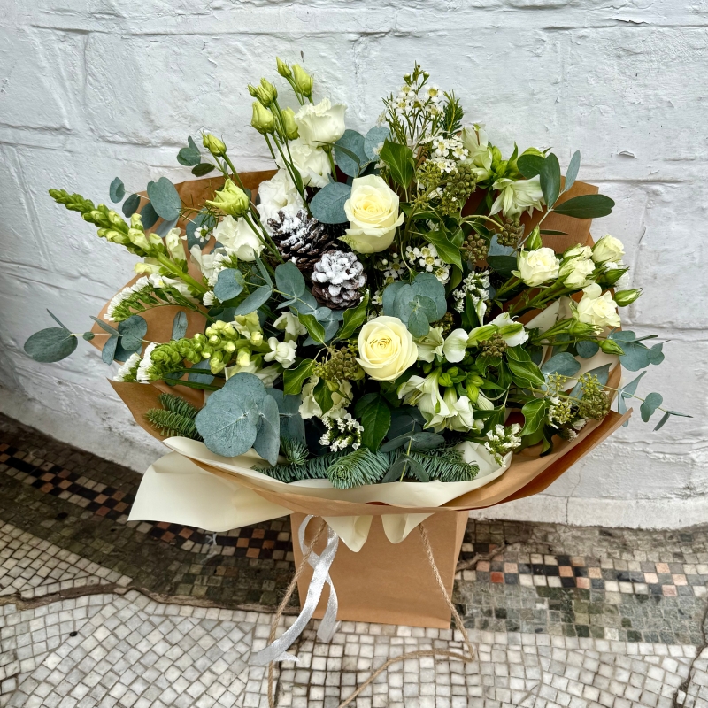 An elegant mix of crisp white blooms, lush eucalyptus and winter foliage.