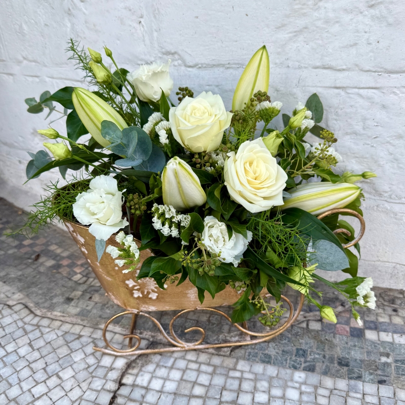Arranged in a gold sleigh-style container, winter white blooms and scented lilies create this piece of Christmas magic.