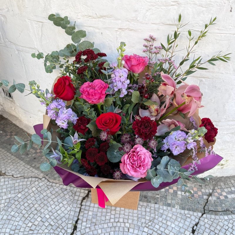 Beautifully scented with stocks and eucalyptus, an extravagant hand tied including roses and a cymbidium orchid.