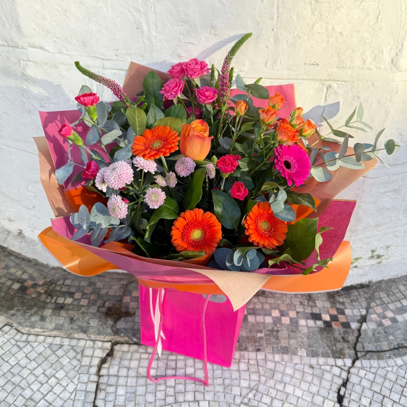 Bright and bold, guaranteed to knock their socks off! Cerise pink and striking orange blooms, including germini, presented in a bright pink gift bag.