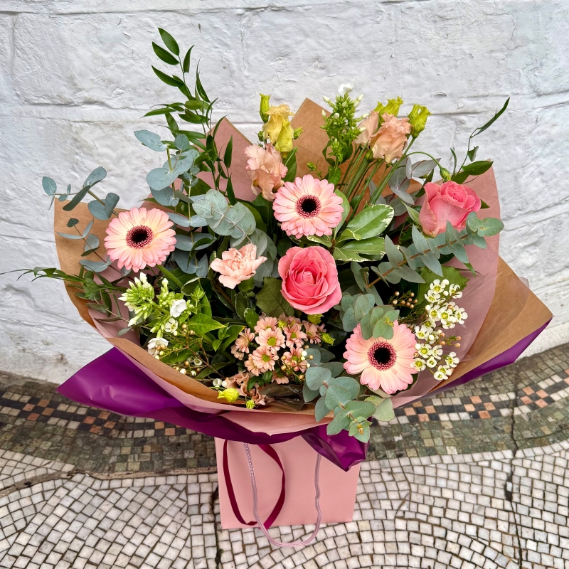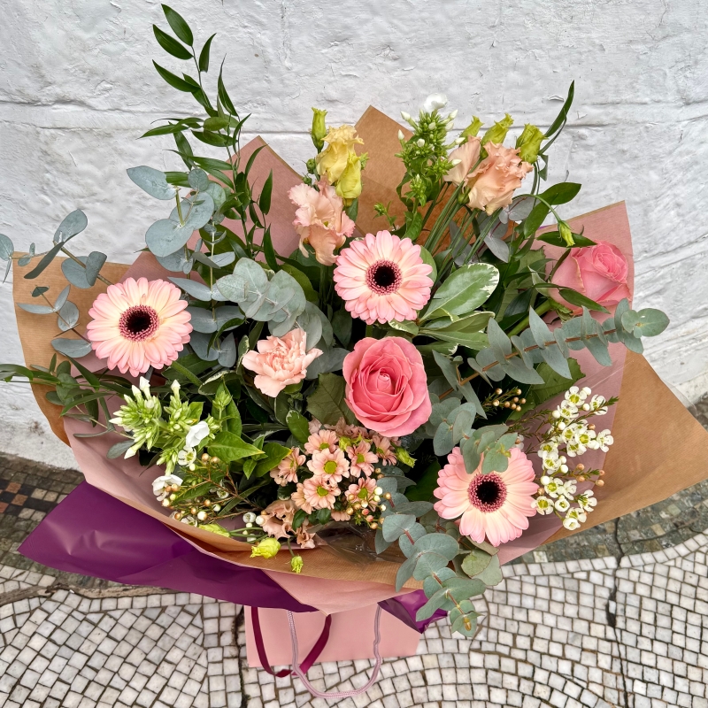 Celebrate Mothers Day with this beautiful, feminine peachy pink hand tied, featuring germini and roses with soft foliages.